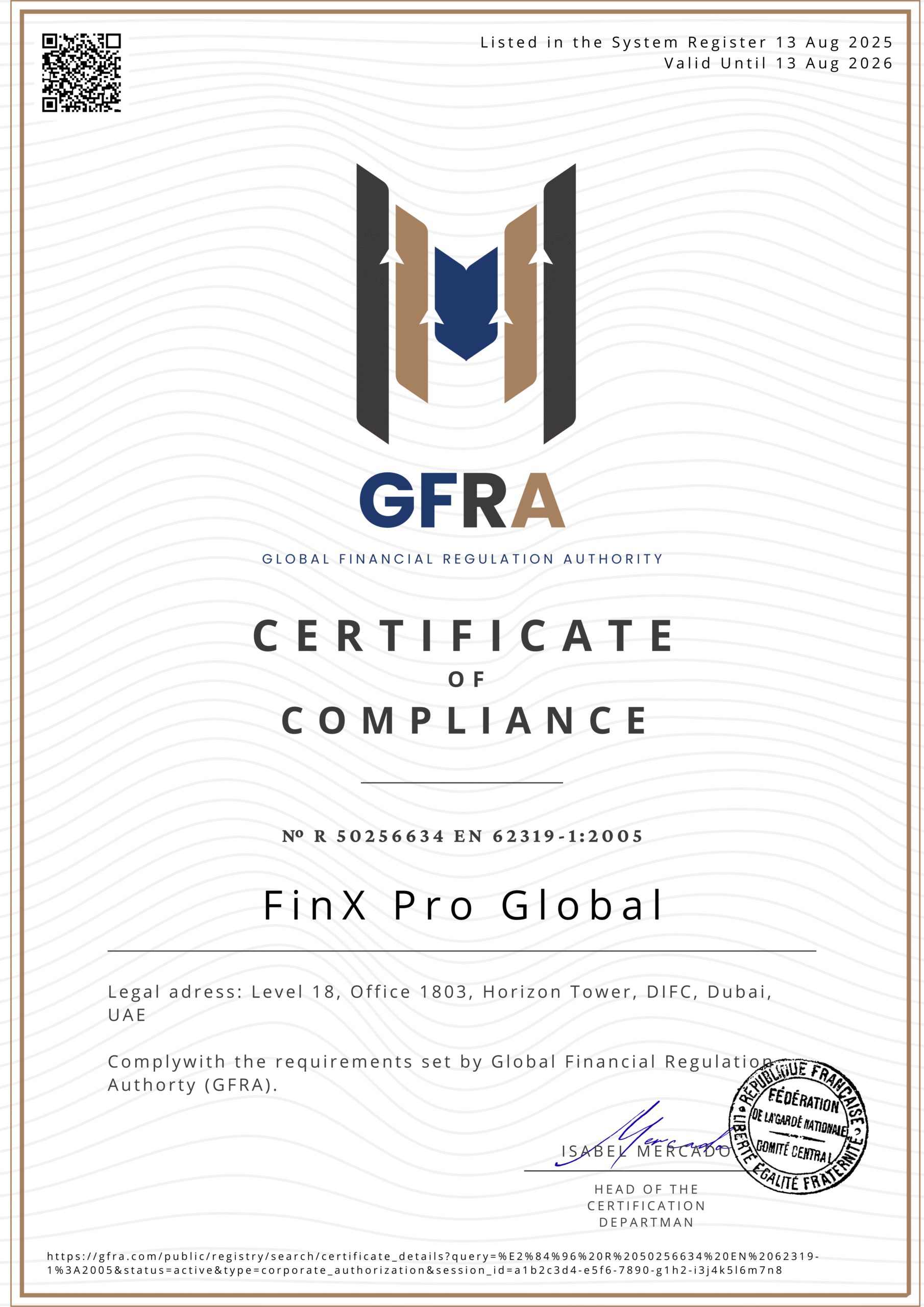 Evet, FinXPro Global uluslararası geçerliliği olan GFRA (Global Financial Regulation Authority) lisansına sahip yasal ve regülasyonlara tabi bir kuruluştur. Yatırımcı memnuniyetini en üst seviyede tutarak ve dünyadaki gelişmeleri sürekli takip ederek en çok tercih edilen aracı kurum olma yolunda ilerlemekteyiz.